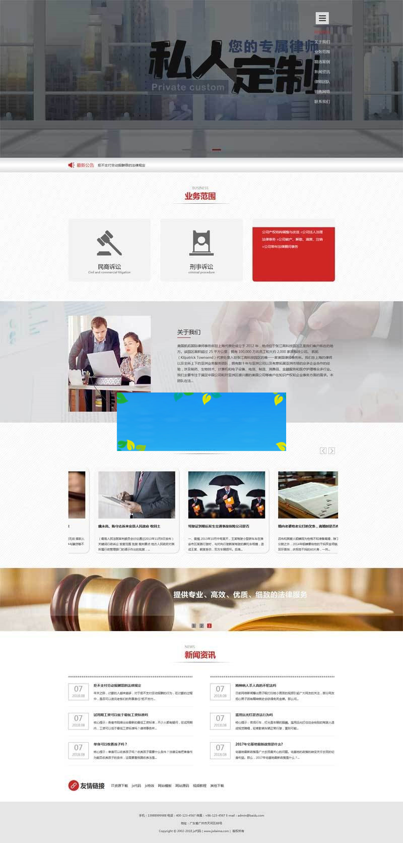 主要有:关于我们、业务范围、精选案例、新闻资讯、律师团队、销售网络、联系我们等模块页面。