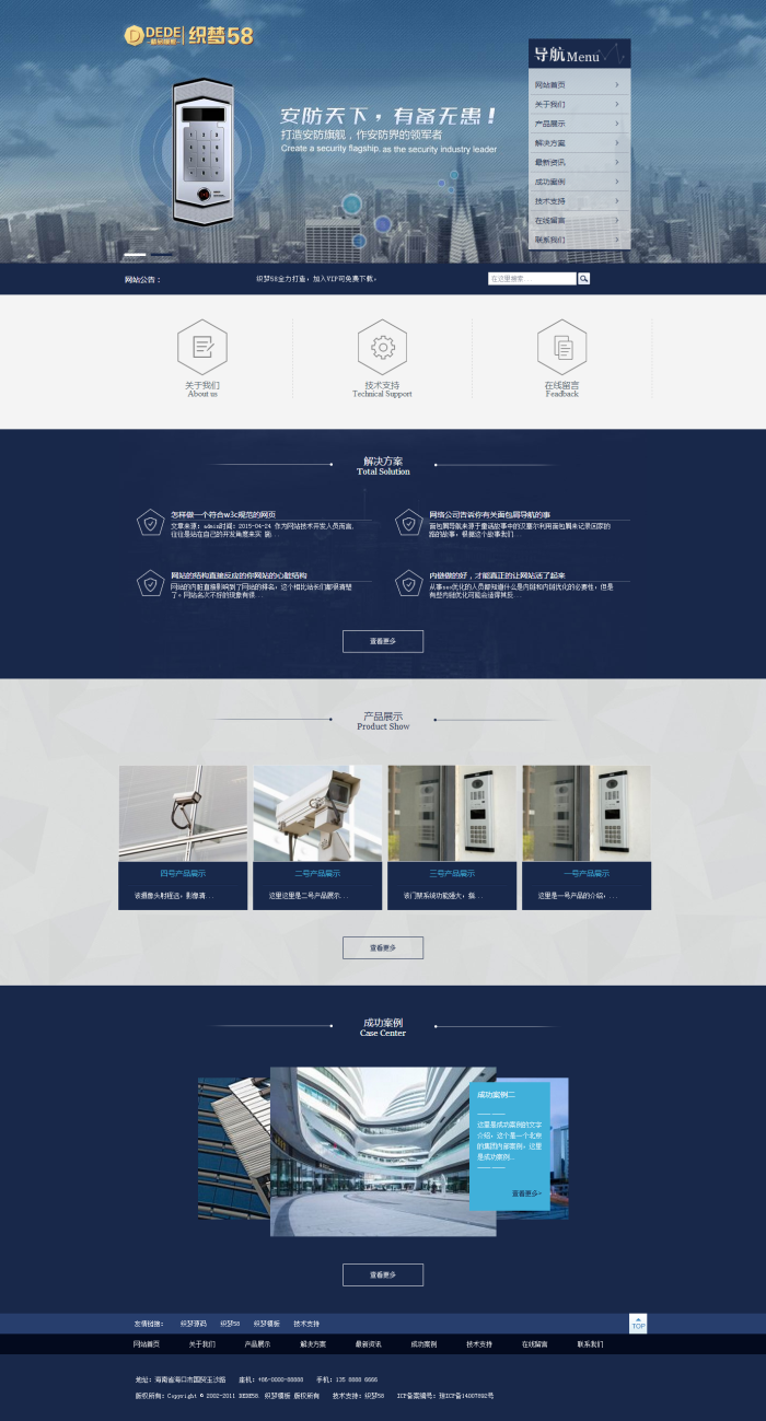 蓝色大气安防设备企业通用网站织梦源码,效果相当的炫酷,相当简洁大气高端,模板简单,全部已数据调用,只需后台修改栏目名称即可。
