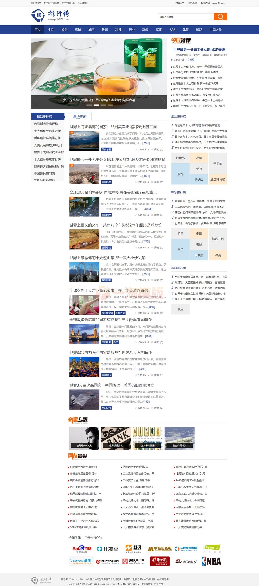 帝国CMS仿《排行榜123网》源码,排行榜资讯类网站模板。精仿的PHB123帝国CMS模板,模板简单大方,也可以修改成任何文章类型的网站。
